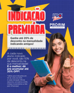 A Pró-Rim Educação está com uma novidade imperdível para seus alunos: a campanha “Indicação Premiada”, que oferece descontos especiais para quem indicar amigos. A cada novo aluno indicado, o participante ganha 10% de desconto na mensalidade, podendo acumular até 20% OFF na próxima mensalidade.